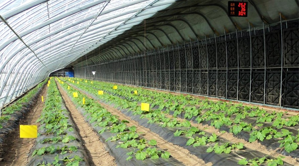2007年以來,項目團隊不斷創新設計,優化結構參數,研發設計出新型水蓄熱內保溫裝配式日光溫室系列產品、智能經緯卷簾控制器、智能放風控制器、新型PEF保溫被、專利蓄熱水箱、CO2氣肥智能控制系統、設施農業物聯網系統等智能裝備。在冬季室外低溫天氣(-30℃)時,不需要人為加溫,水蓄熱內外雙保溫裝配式日光溫室內部溫度可達到8℃以上,比普通日光溫室高出5℃以上,保證了喜溫性園藝作物正常越冬生產。